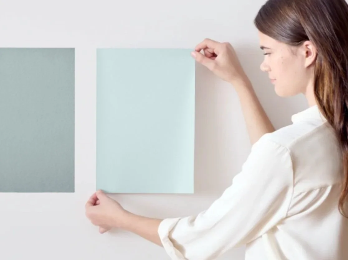 Once you’ve gotten your fill of options online, you may find yourself eager to get out there and see some of these colors for yourself. We recommend visiting your local paint stores to see what options are out there and also to pick the brains of the professionals in shop. Some helpful tools you could walk away with include swatches and peel & stick paint samples (seen below). Once you have swatches or peel & stick samples, you can check them out in the actual space to see how they look, especially as the light changes throughout the day. If you’re feeling extra ambitious, you could get an actual paint sample along with some primer (if the change is more than subtle) and check out how the actual paint looks on your wall.